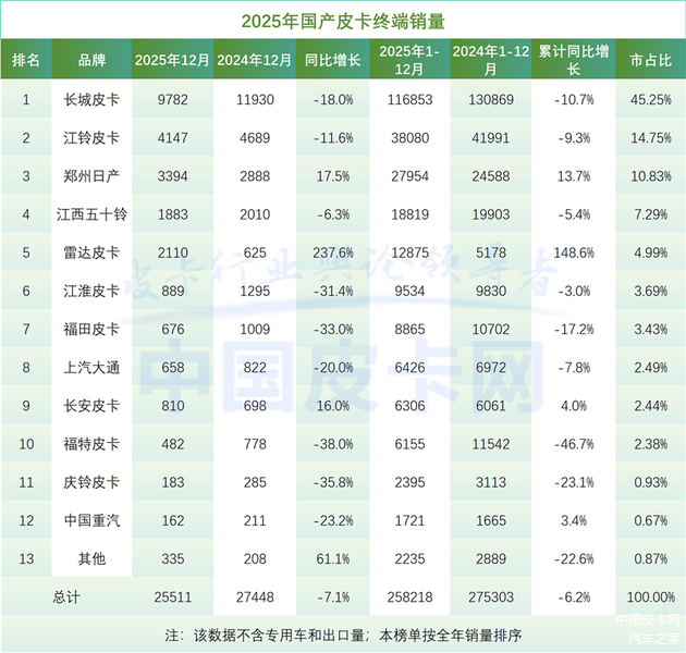 2025年的皮卡市场数据,清晰地展现了这一趋势:全年国内总销量25.82万辆,同比下降6.2%,整体市场呈现收缩态势;但新能源皮卡却逆势爆发,全年销量达2.41万辆,同比增长108%,市场渗透率首次突破9%,更具标志性的是,雷达汽车作为皮卡新兵,在2025全年销量接近1.3万台,同比暴增148.6%,市占率逼近5%,一举冲入皮卡品牌榜前五,更是成为了2025年为数不多实现正增长的皮卡企业,其核心竞争力正是“带电”属性。
