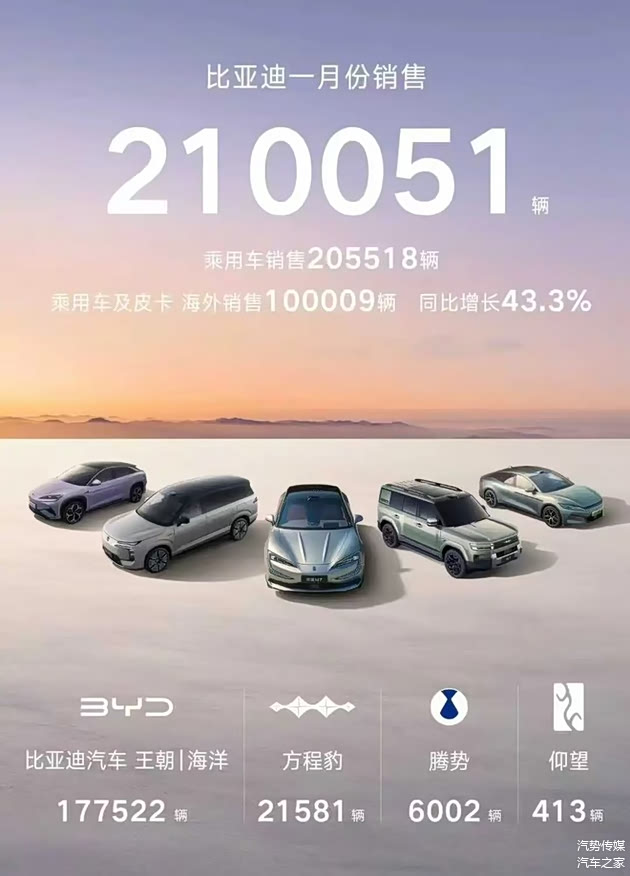 比亚迪乘用车销量205,518辆,海外销量约10万辆,同比增长43.3%,与出口冠军奇瑞的差距已缩小至20%以内。王朝与海洋网络合计销售17.75万辆,方程豹、腾势、仰望等品牌销量分别为21,581辆、6,002辆和413辆。