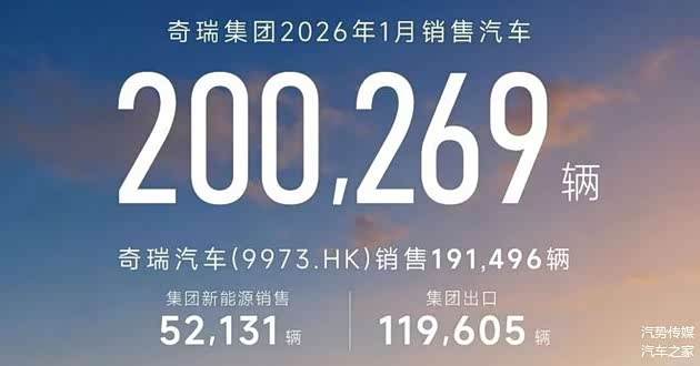 奇瑞集团出口达11.96万辆,占总销量近六成,持续领先;国内销量约8万辆,与出口形成反差。集团新能源销量5.2万辆,表现平稳。