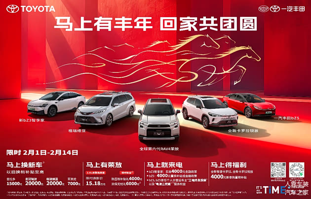 年味渐浓,归途可期。一汽丰田以一份诚挚礼遇,守护每个家庭的团圆之旅。2月1日至2月14日,一汽丰田推出限时活动,皇冠陆放、格瑞维亚等明星车型享至高20000元的置换补贴;全新第六代荣放限时焕新价15.18万元起,并可享4000元的购置税补贴和6000元的双保无忧礼;纯电“双子星”bZ3智享家和bZ5至高享4000元购车补贴和“三电终身质保”“电池三兜底”的服务权益;全新智混卡罗拉、全新卡罗拉锐放也可享4000元新春购置税补贴。