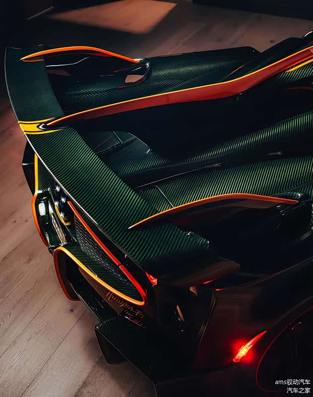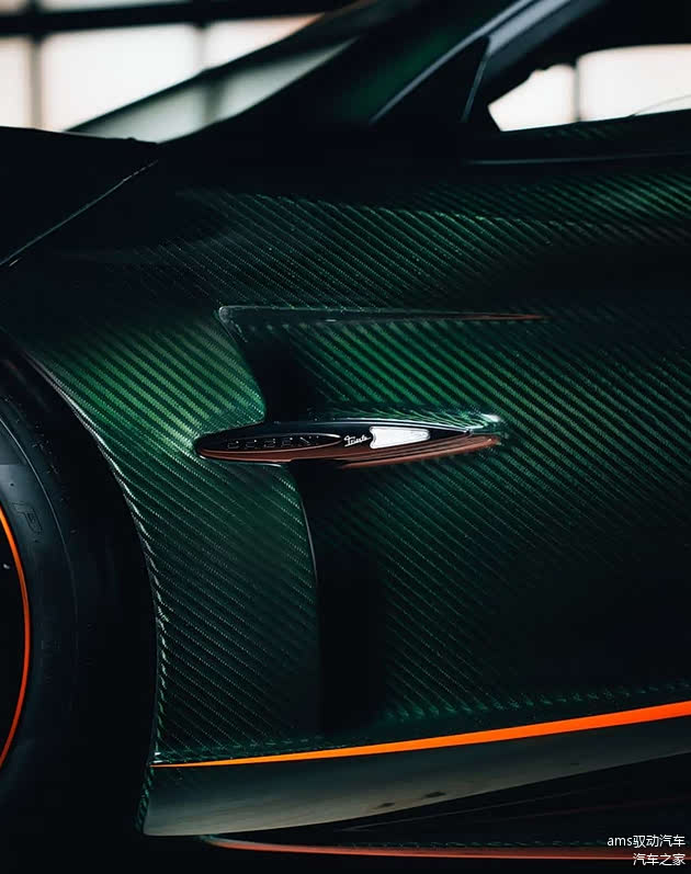 其余所有车身部件,包括全新设计的前大灯,都明显借鉴了Huayra Codalunga Longtail这一特别版车型的设计元素。通过帕加尼官方社交媒体渠道发布的Trionfo车型,采用了绿色着色碳纤维车身。橙色喷涂的附加部件为整车带来了鲜明的视觉点缀。车尾部分的特征包括全新的后包围、新的通风导流通道以及重新设计的扩散器。