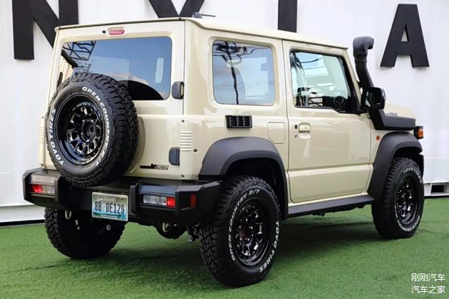 侧面还是熟悉的吉姆尼轮廓,方方正正没变,但细节堆得更满。右侧A柱加了涉水喉,这个东西在真正涉水时当然有意义,但更多时候它承担的是“越野氛围组”的任务。贯穿式腰线让侧面更有层次,轮眉和侧裙上也加了粗壮的黑色饰板,视觉上更厚、更结实。轮毂是多幅熏黑造型,配AT越野胎,属于既能跑烂路也不至于太“比赛化”的搭配,日常通勤还能接受,但胎噪和油耗大概率会比原厂更明显,这点要有心理准备。