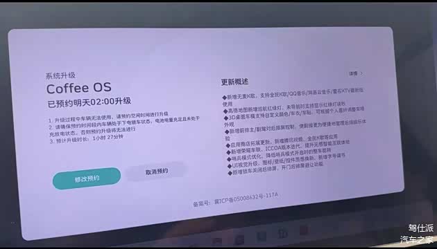 收到OTA推送是在1月底,我选择在深夜的时候进行自动升级,这样就不会影响日常使用。需要注意的是,升级前要保证车辆没有在充放电状态,且电量足够——一句话,充好电然后放着让它升级就行。从说明书来看,边充电边升级应该是不行的。