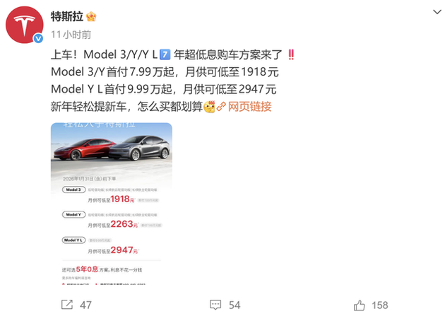 特斯拉1月24日官方宣布推出7年低息金融政策,实际年费率低至0.5%,折合年化利率0.98%,最高年化利率1.36%,同时叠加8000元限时保险补贴,综合变相让利1-2万,覆盖Model Y全系,优惠截止1月31日(含)前提车。