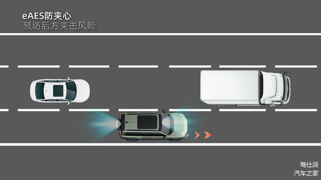 针对高速路段常见的前车急刹、后车紧逼的“夹心碰撞”风险,升级后新增的eAES防夹心功能发挥了重要作用。当车辆行驶中遇到前车急刹导致车速快速下降,且后方车辆快速逼近存在追尾风险时,系统会自动监测旁侧车道是否具备变道条件,若条件允许则规划最优避险路径,辅助车辆平稳变道,有效降低高速拥堵场景下的事故风险。