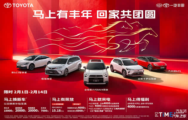 2月1日至2月14日,一汽丰田推出限时活动, 皇冠陆放、格瑞维亚等明星车型享至高20000元的置换补贴;全新第六代荣放限时焕新价15.18万元起,并可享4000元的购置税补贴和6000元的双保无忧礼;纯电“双子星”bZ3智享家和bZ5至高享4000元购车补贴和“三电终身质保”“电池三兜底”的服务权益;全新智混卡罗拉、全新卡罗拉锐放也可享4000元新春购置税补贴。