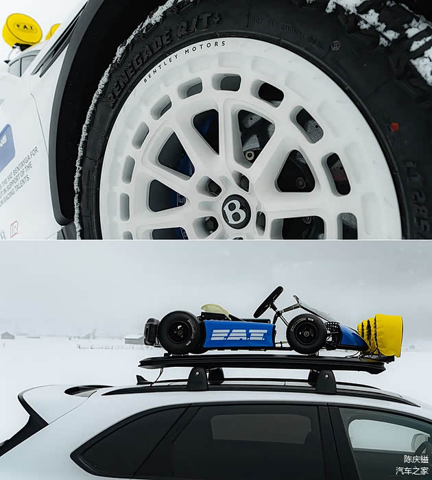 外观方面,Bentayga X Concept 则是以功能性设计为核心,车顶配备储物装置与四盏探照灯,能为长途越野旅程提供支援,并装载了一辆 FAT 卡丁车联赛(FAT Karting League)的迷你电动卡丁车。因此,车顶加装上述部件后,Bentayga X Concept 的整体高度达到 2.49 公尺,且搭载钛合金材质的 Akrapovic 运动排气系统,并加装有拖车钩。
