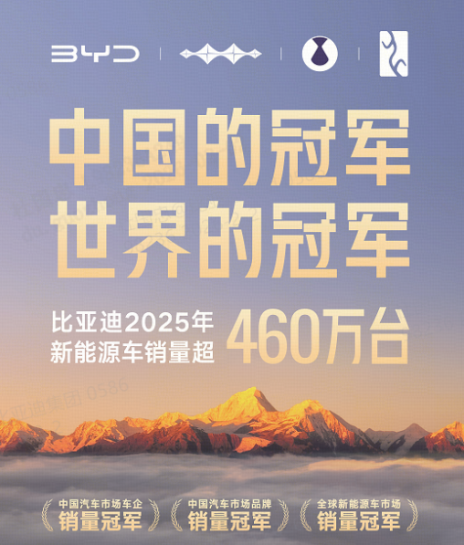 全年超460万辆,包揽中国车企、品牌双冠,并连续四年蝉联全球新能源销冠,再一次彰显世界冠军硬核实力