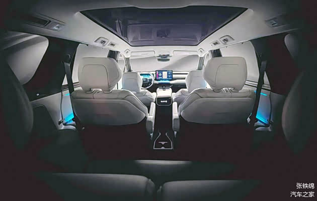 从最新的内饰图来看,新车采用的是2+2+2座椅布局,其中第二排是两个独立式的座椅,带有内侧折叠式座椅扶手,车顶是全景天幕,后排的空调出风口位于车顶两侧位置,中控台造型简约,使用了悬浮式的仪表盘和中控屏。