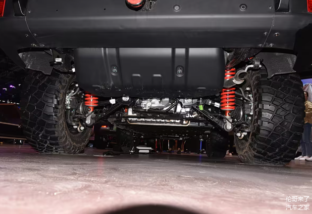 先说说这近28万的赤兔版,气场十足,红漆亮眼,离地间隙高达300毫米,普通城市SUV才180毫米左右。原厂配备的295/60 R20 AT胎,走烂路稳稳当当。还有那双向可调氮气减震,玩越野的都知道其价值,原厂备案,合法上路,多省心。