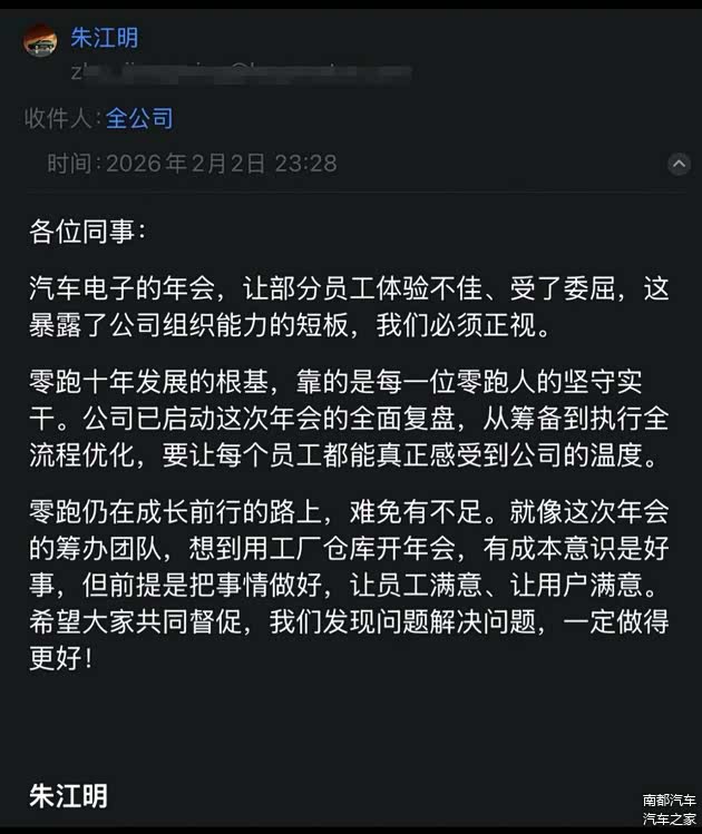 2月2日晚,朱江明发布全员信,坦言上述年会安排“暴露了公司组织能力的短板”“必须正视”,并表示,“公司已启动这次年会的全面复盘,从筹备到执行全流程优化,要让每个员工都能真正感受到公司的温度。”