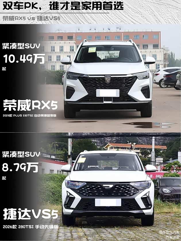 最近后台好多兄弟问我10万级SUV怎么选,今天直接拉出两款热门选手—— 荣威RX5 2025款 PLUS 330TGI 自动领潮智惠版(10.49万)和捷达VS5 2026款 280TSI 手动先锋版(8.79万)硬核对比!看完这篇你就知道该冲哪台了🔥