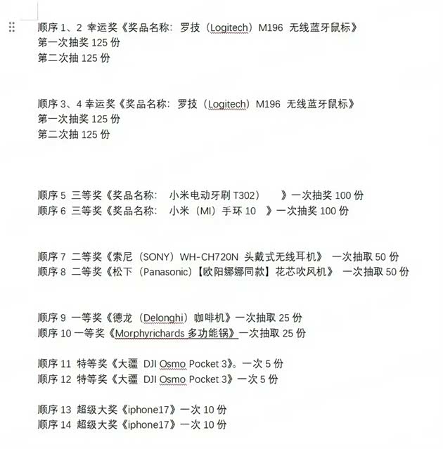 与此同时,“抽奖”也是其中一个“高成本”环节。年会奖品分为幸运奖、三等奖、二等奖、一等奖、特等奖和超级大奖,分别为500份蓝牙鼠标、100份电动牙刷和100份手环、50份无线耳机和50份吹风机、25份咖啡机和25份多功能锅、10份大疆云台相机、20份iPhone17。