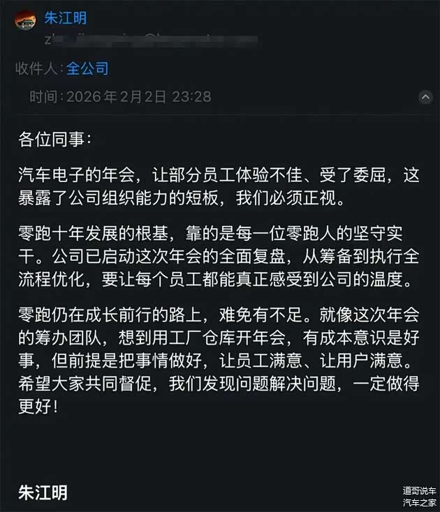 近日,“多名员工吐槽零跑年会”成为行业热点话题,网传消息显示,1月30日,零跑汽车在湖州举办电子产品线年会,不少参会的零跑员工以“拉胯”来形容这场零跑年会。冷、热水供应短缺等均成为员工吐槽重点。2月3日,零跑汽车创始人朱江明发布内部信回应该事件。