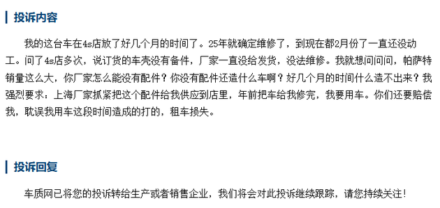 此外,还有帕萨特新能源车主反映,车辆维修所需配件长期缺货,“4S店说订货的车壳没有备件,厂家一直没给发货,没法维修”。