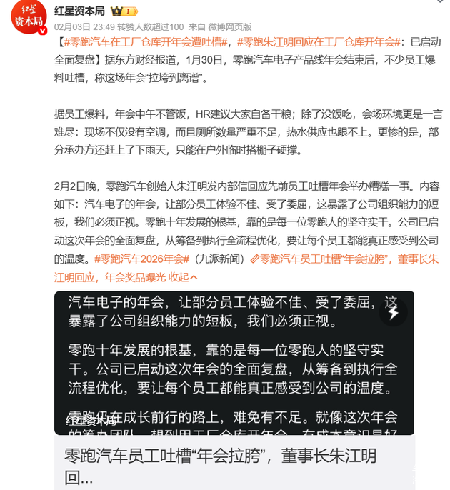 网传员工吐槽年会拉胯,零跑朱江明回应
