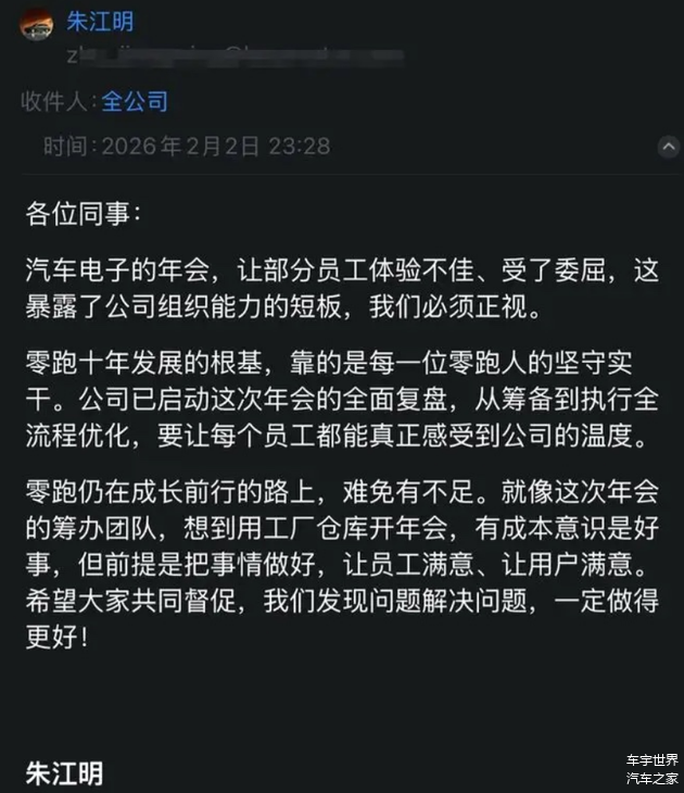 作为回应,零跑汽车掌舵人朱江明在内部信中承认这次年会“暴露了公司组织能力的短板”,必须得到正视。