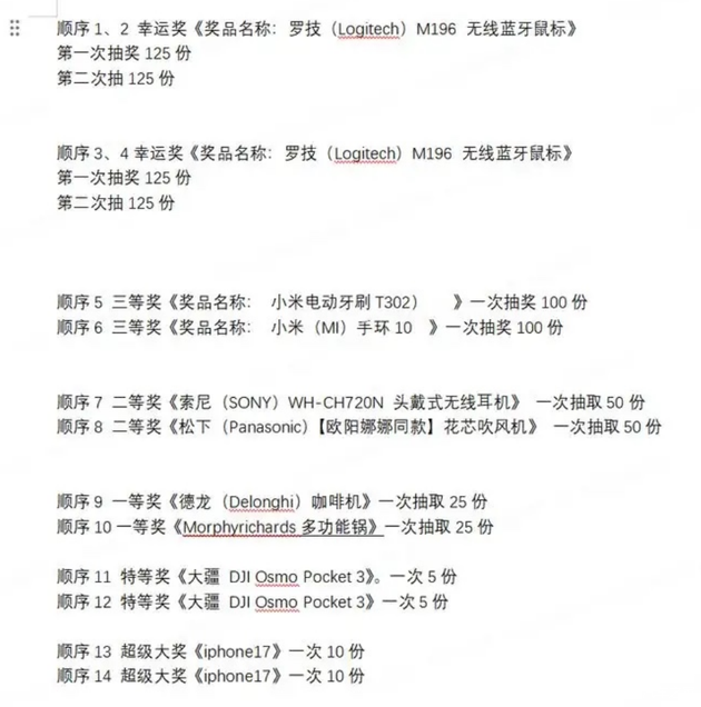年会奖品设置也较为丰厚,分为多个奖项:幸运奖500份蓝牙鼠标;三等奖包括100份电动牙刷和100份手环;二等奖有50份无线耳机和50份吹风机;一等奖包括25份咖啡机和25份多功能锅;特等奖为10份大疆云台相机;超级大奖为20份iPhone17。