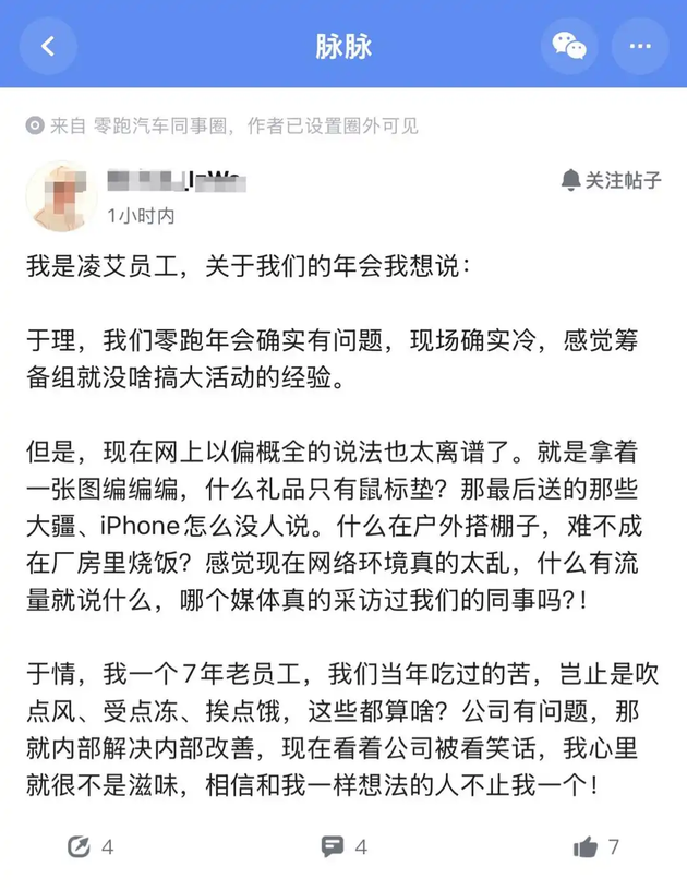 在社交平台上,也有零跑员工进行回应。一位自称7年的老员工发帖表示,年会现场确实冷,感觉筹备组就没啥搞大活动的经验,但网上有些以偏概全的说法太离谱。该员工称:“什么礼品只有鼠标垫?那最后送的那些大疆、iPhone怎么没人说。什么在户外搭棚子,难不成在厂房里烧饭?感觉现在网络环境真的太乱,什么有流量就说什么,哪个媒体真的采访过我们的同事吗?!”