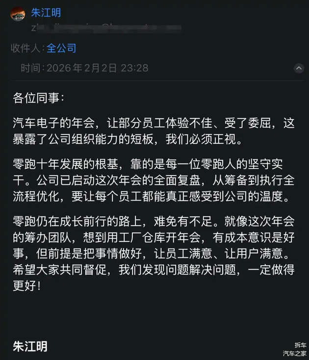 朱江明表示:“汽车电子的年会,让部分员工体验不佳、受了委屈,这暴露了公司组织能力的短板,我们必须正视。零跑十年发展的根基,靠的是每一位零跑人的坚守实干。公司已启动这次年会的全面复盘,从筹备到执行全流程优化,要让每个员工都能真正感受到公司的温度。零跑仍在成长前行的路上,难免有不足。就像这次年会的筹办团队,想到用工厂仓库开年会,有成本意识是好事,但前提是把事情做好,让员工满意、让用户满意。”