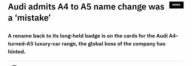 最近,外媒DRIVE分享了一条不大不小的新闻,奥迪全球CEO Gernot Döllner(高德诺)最近在接受采访时,坦承表示:将招牌车系 “A4” 改名为 “A5” 是一个错误的决策,并将在下次更新或换代时改回来。