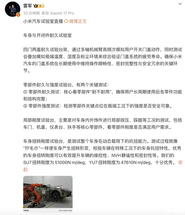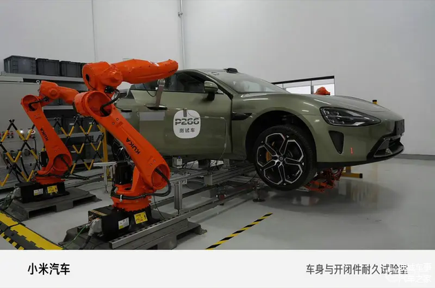 小米汽车近日对其研发体系中的车身与开闭件耐久试验室进行了详细介绍。该试验室主要承担车辆相关结构及部件的可靠性与刚性测试工作。其中,四门两盖耐久试验台架通过机械臂模拟高频次的开合动作,以此检验车门、引擎盖、后备箱盖等在长期使用下的疲劳寿命。测试过程不仅模拟日常开关力度与频率,还会结合高温、低温、潮湿及多尘等复合环境条件,综合评估铰链、锁止机构等部件的耐久表现。