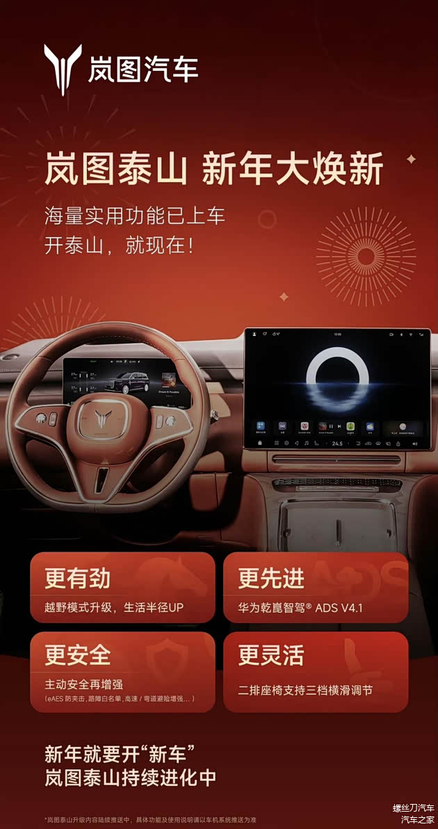 2月4日,岚图汽车向 岚图泰山车主正式推送首次重大OTA升级!此次升级以华为乾崑智驾ADS 4.1为核心,覆盖智能座舱、辅助驾驶、越野性能三大维度,用“商务+越野”双场景差异化优势,直接改写高端商务SUV的价值规则。