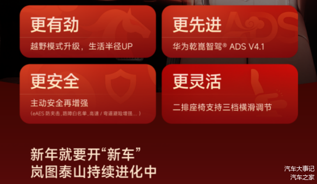 2026年2月4日,岚图汽车向泰山车主正式推送首次重大OTA升级。此次升级以华为乾崑智驾ADS 4.1为核心,覆盖智能座舱、辅助驾驶、越野性能三大维度。