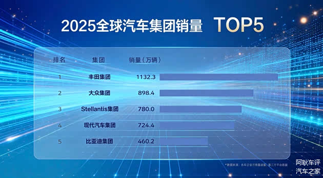 2025年全球汽车集团销量排名正式出炉。丰田集团以1132.3万辆的销量连续第六年位居榜首。大众集团以898.4万辆位列第二。
