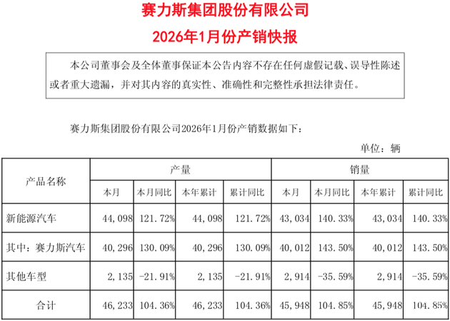 懂车的都清楚,1月份从来不是汽车销售的好时候,多数车企都在“熬淡季”,销量能稳住不滑坡就已经算合格。但赛力斯偏不,2026年1月直接交出了一份亮眼答卷,不仅没受淡季影响,反而实现产销双增破纪录。根据赛力斯2月1日官方发布的产销快报,1月份公司合计产量46,233辆,同比增长104.36%;合计销量45,948辆,同比增长104.85%,产销基本持平,库存合理、供应链顺畅。要知道,这可不是小幅度增长,而是实打实的翻倍,而且是在行业淡季实现的,含金量十足。很多人好奇,赛力斯到底是怎么做到的?咱们一步步拆解,最后再聊聊它接下来会怎么布局?
