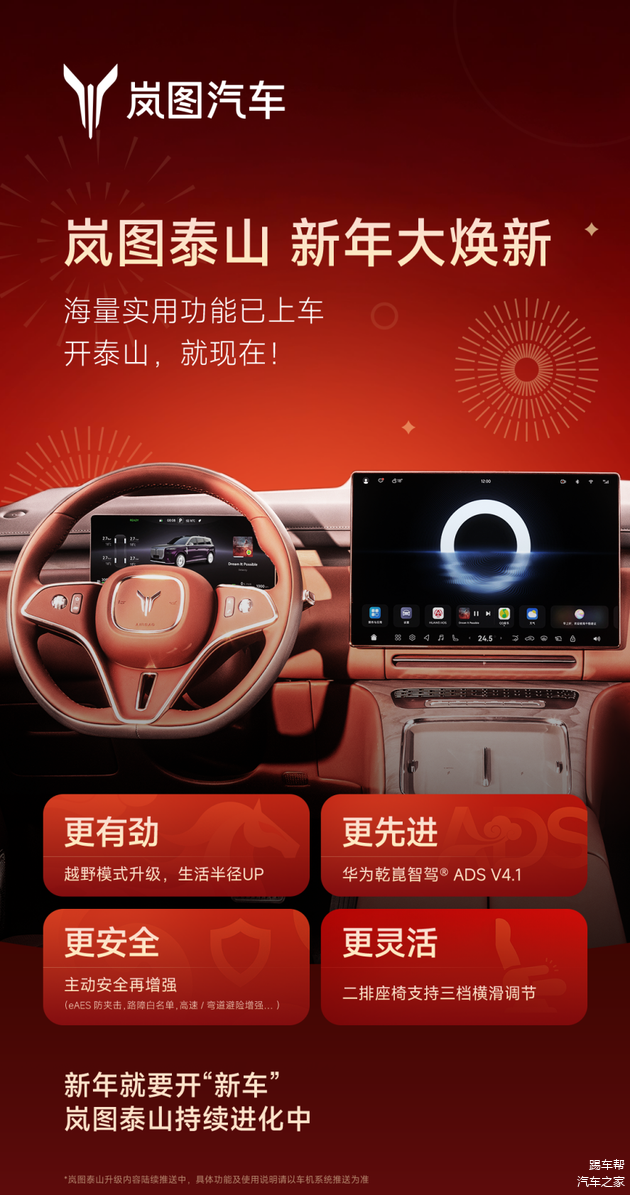 作为岚图汽车的旗舰级SUV车型,此次OTA的升级,进一步确立了岚图泰山的产品地位,同时也通过更智能的华为智驾、更贴心的乘坐体验和更安全的越野能力,全面满足家用、商务和越野的出行需求。