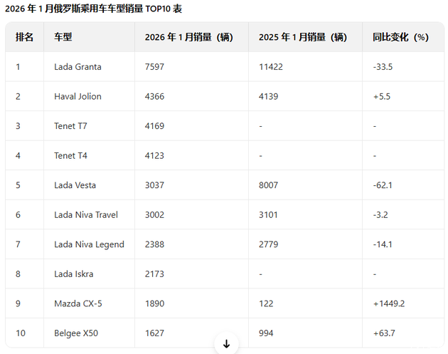 2026年首月,俄车市“量跌价稳”,Lada继续领跑,Tenet新品牌异军突起,马自达CX-5凭借供应恢复暴涨1449%,而长期霸榜的奇瑞系首次集体下滑,市占率跌破20%。对于奇瑞而言,如何在新品周期与价格策略之间找到平衡,将是全年能否翻盘的关键。