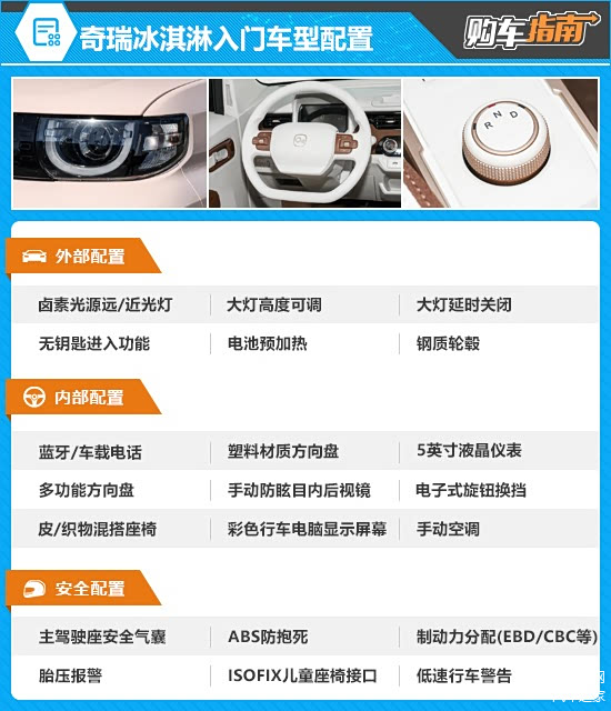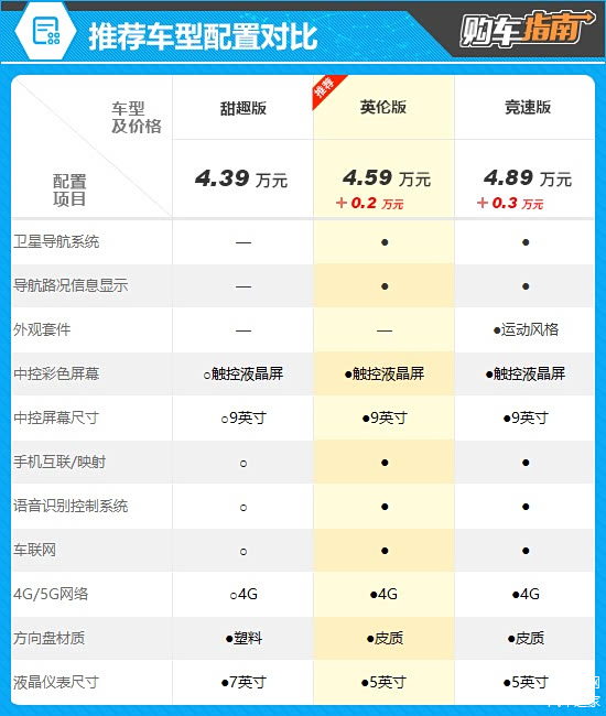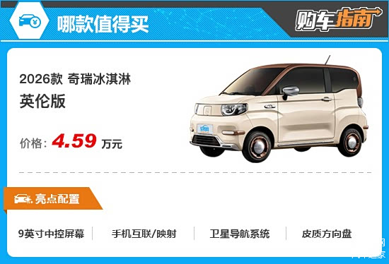 纵观2026款冰淇淋全系车型,英伦版无疑更值得推荐。推荐车型补齐了入门车型在娱乐功能方面的短板,标配9英寸中控屏幕,并提供了手机互联/映射、语音识别控制系统、车联网等丰富的配置。此外,推荐车型还升级为皮质方向盘,手感更出色。价格方面,推荐车型相比入门车型也仅增加了2000元,可谓物有所值。