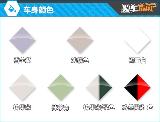 外观颜色方面,甜趣版提供香芋紫、浅藕色、椰子白、榛果米、抹茶青5种车漆可选,均搭配黑色车顶;英伦版以榛果米作为基础色,并在车顶和轮毂等部位加入奶茶棕装饰;竞速版采用红色和冷萃黑双拼色设计;女王版则采用榛果米以及绿色涂装。