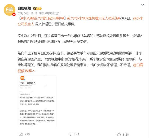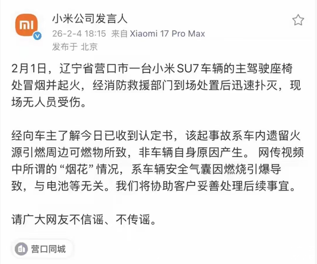 2月4日,小米公司发言人通过官方社交媒体平台迅速作出回应,明确指出该起事故系“车内遗留火源引燃周边可燃物所致”,而非车辆自身原因。