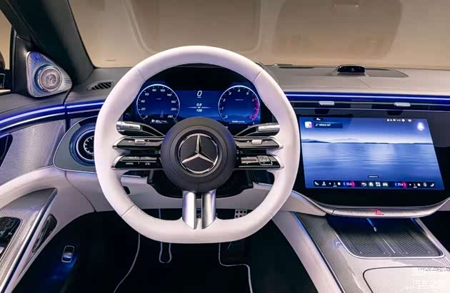 相比于外观,内饰设计的变化更大。仪表台全面焕新,中央的14.3英寸触控屏不再与中控台相连,而是和12.3英寸的副驾娱乐屏一起被覆盖在一块整体的玻璃板下面,形成一块超级屏,而仪表盘则独立在超级屏外。