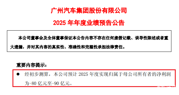 业绩预告显示,广汽集团2025年归母净利润预计巨亏80亿元至90亿元。2024年,广汽归母净利润还有8.24亿元。