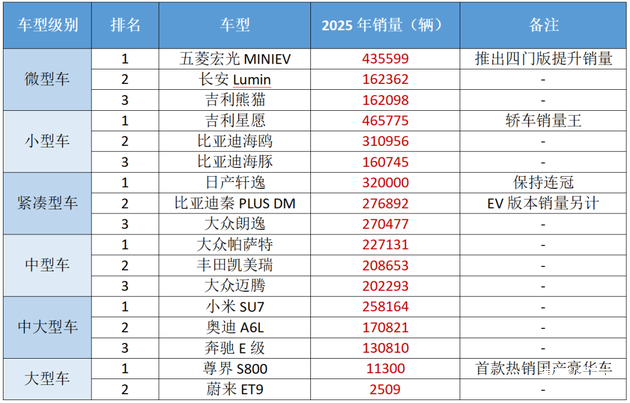 看到表格里红红的数字了吧!今天我们来盘点2025年各级别卖得最好的轿车,其实这个榜单中的车都是大家耳熟能详的,前4个级别的大哥大都没有变化,中大型车则是小米SU7顺利登顶,而大型车的销冠则是在2025年全新上市的尊界S800,70万起的售价能卖出超10000台,是真正打破了豪华车市场的格局。