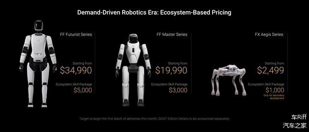 FF EAI机器人独创“终端+生态技能包”全新生态价格体系:Futurist 系列终端起售价为 $34,990,生态技能包价格为$5,000;FF Master 系列起售价为 $19,990,生态技能包价格$3,000;FX Aegis系列 起售价为 $2,499,生态服务包价格$1,000。这一杀手级价格,将加速EAI机器人普及,推动其从概念走向规模化、刚需化的实际应用时代。