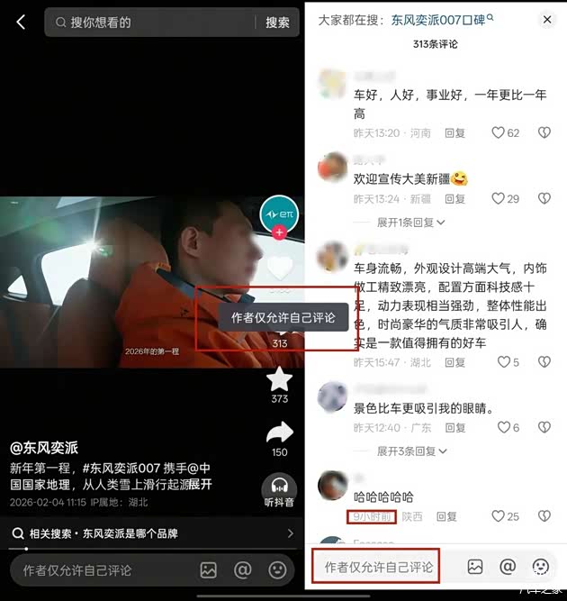截至发稿,东风奕派官方未就该视频作出回应,但其抖音官方账号已经设置“仅允许自己评论”,评论区最后一批留言在2月5日早上发出。