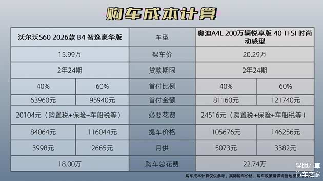 如果是首付60%,也就是12.1万,算上购置税、保险等杂费,14.6万左右能把车开回家,然后每月还款3300多元。这样对比就可以发现,买沃尔沃S60真的要轻松很多。当然了,小编在本文内展示的购车成本计算仅供大家参考,实际的购车价格、购车政策请详询当地授权经销商。