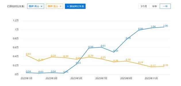 不过,在魏牌的高光背后,细究之下实际上已经暗藏隐忧。其中,作为魏牌的两大销量核心高山、蓝山在2025年交出了截然不同的走势。高山在去年5月推出新款之后,销量一路上涨,到去年底已经实现连续过万,且取得单月MPV市场冠军。全年销量达到5.9万辆,是魏牌在2025年实现规模化增长的关键。