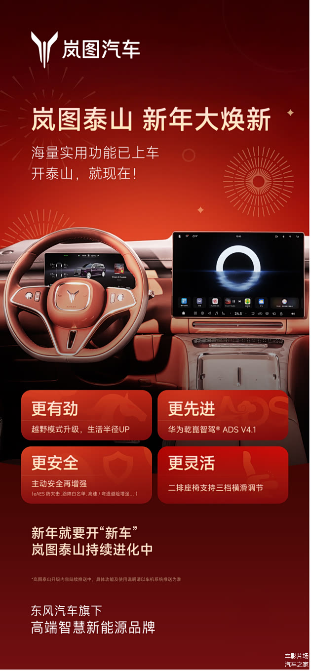 以乾崑之智,成泰山之稳。岚图泰山此次OTA,既是产品力的全面进阶,更是岚图“以用户为中心”与技术创新的集中体现。华为顶级智驾+独有的越野优势+贴合需求的座舱优化,重新定义高端商务SUV的全能边界。未来,岚图汽车将继续秉持“共赴美好生活”的品牌使命,以技术创新驱动产品升级,为高端用户打造更有温度、更全能的智能移动空间,推动高端商务SUV市场进入全场景发展的新阶段。