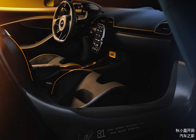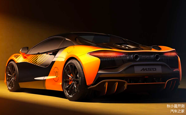 首先这台车采用了迈凯伦经典的橙色和黑色的双色涂装,在整体的运动感氛围上营造出了极强的战斗氛围,而且这个涂装正是去年迈凯伦F1赛车MCL39的涂装,这也是对经典赛车的一种致敬。可以看到整个前唇有着十分夸张的空气动力学设计,两侧上下各有一处开口,并且和车灯融为一体。另外,车辆后部还有着特殊的拉花和10颗星星以及10次获得总冠军的F1赛车剪影。