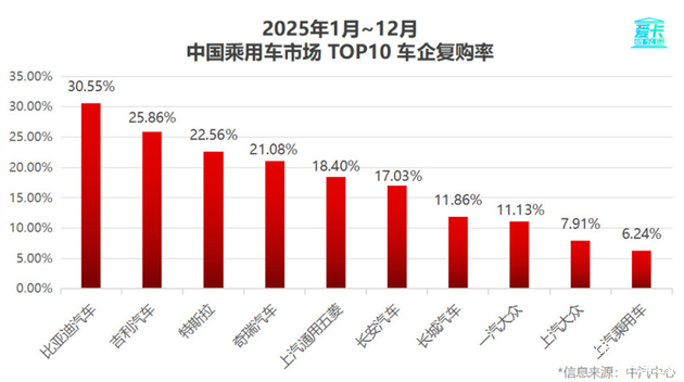 根据爱卡研究院发布的《2025年车企复购率榜单》显示,比亚迪老车主复购率达30.55%,位居第一,大幅超越吉利、奇瑞、长安等传统主流车企。汽车行业“规模扩大必稀释忠诚度”的惯性认知,被比亚迪打破。