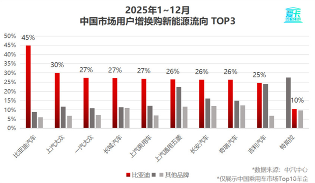 更关键的是,比亚迪在新能源增换购市场形成强大“虹吸效应”,无论是比亚迪自身老车主,还是主流合资、自主品牌车企用户,在置换新能源车型时,均将比亚迪列为首选品牌。在国内乘用车市场TOP 10车企用户中,平均每4个增换购新能源的用户里,就有1个投向了比亚迪,这一数据不仅佐证了比亚迪在新能源增换购市场的统治力,更印证其已成为全行业用户置换新能源的核心流向品牌。