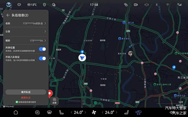 而在多人出行场景中,问界M9的情感交互能力更显细腻。新增的地图组队出行功能,支持创建或加入出行队伍,实时共享位置与导航路线,有效避免“车队走散”。更妙的是,导航界面内置语音对讲,驾驶者无需切换应用即可与队友实时沟通,分享沿途见闻,让多车同行成为真正意义上的相伴之旅。