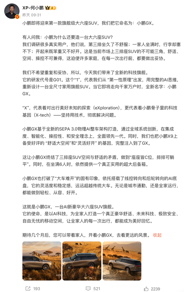 和此前官宣小鹏P7+时一样,临近春节,小鹏再次亲自下场,在社交平台甩出长文,把 小鹏GX的核心定位、技术底牌、产品优势全盘托出,瞬间引爆行业热议。