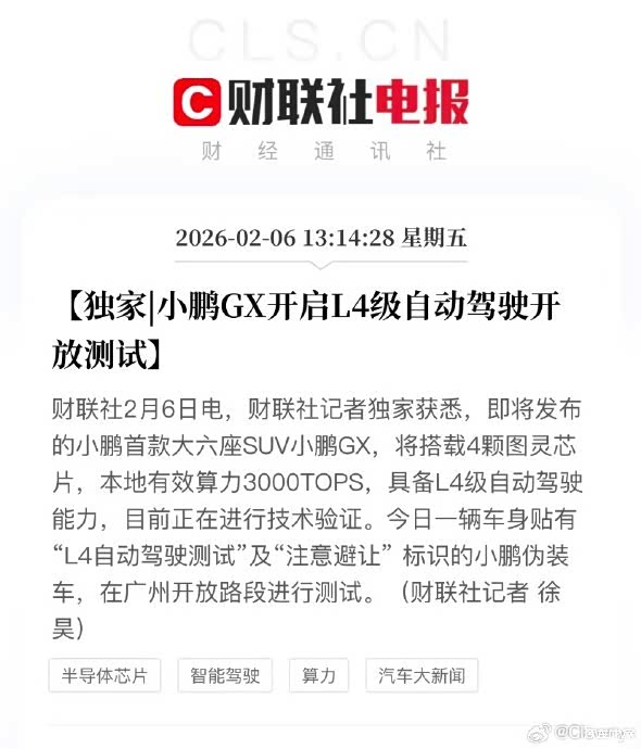 2026年2月6日,据财联社独家消息,小鹏首款大六座SUV 小鹏GX已在广州开放道路启动L4级自动驾驶实测,车身贴有“L4自动驾驶测试”“注意避让”标识,进入关键技术验证阶段。