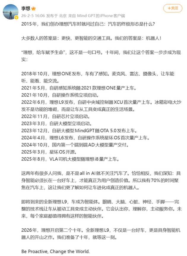 同时值得注意的是,就在昨天,李想在社交媒体上发文,称全新理想L9将把车变为智能体,还提到:“2026年,理想开启第二个十年。全新理想L9,不仅是一台好车,更是具身智能机器人的开山之作。我们准备了十年,就等这一刻。”